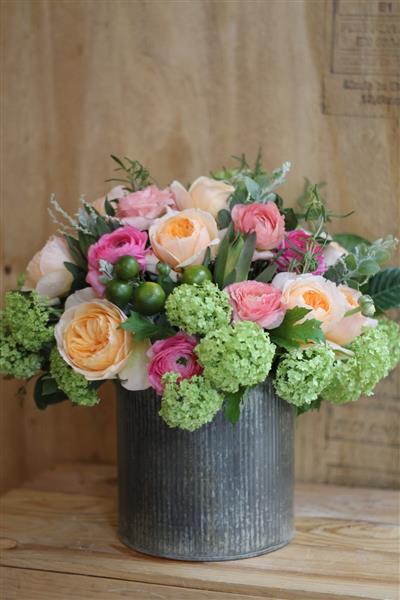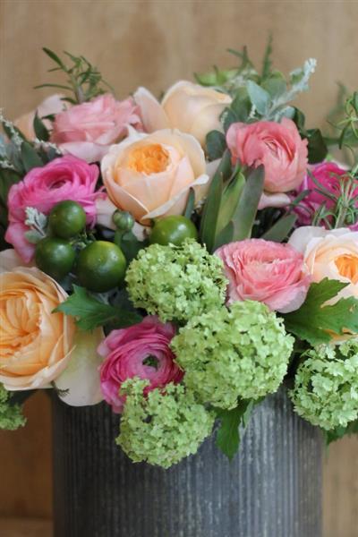 This beautiful tin arrangement of summer flowers really is stunning. At SW Blooms we love using Juliet, David Austin Roses at every opportunity we get. This elegant arrangement uses these beautiful roses in abundance with pink ranunculus, green viburnum and berries.