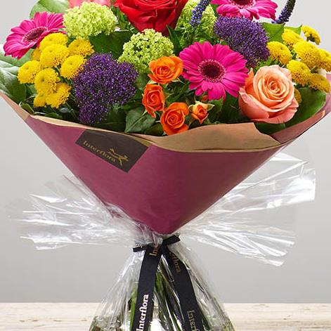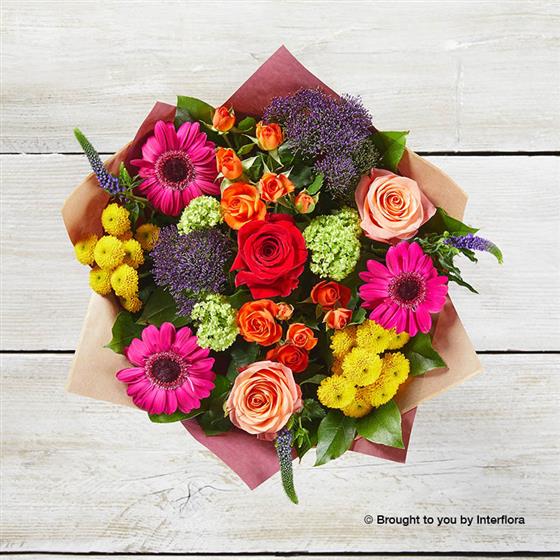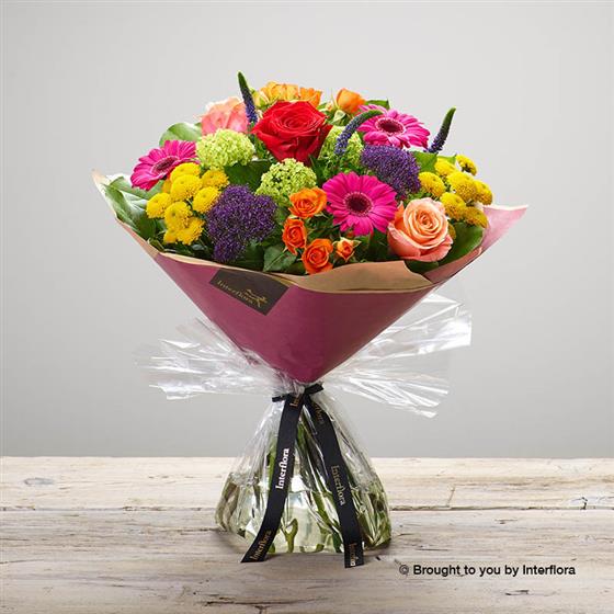 Featuring a red large headed rose, peach large headed roses, orange spray roses, cerise germini, green viburnum opulus, yellow spray chrysanthemums, blue veronica and blue trachelium with salal, hand-tied, wrapped and presented in gift packaging. Standard Price Point Pictured.