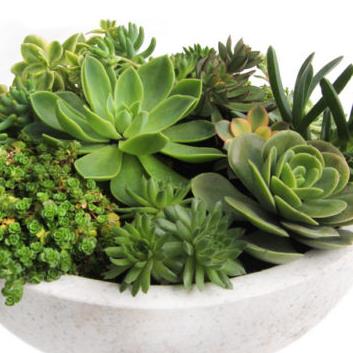 A mix of large and medium size succulents into a white bowl. Easy to look after, this only needs a small amount of water when it dries out.
