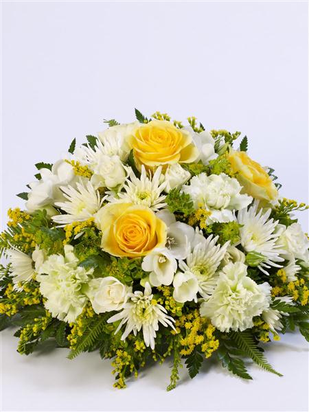 A classic selection in lemon and white including large-headed roses, freesias, lisianthus and spray chrysanthemums presented in a posy design.