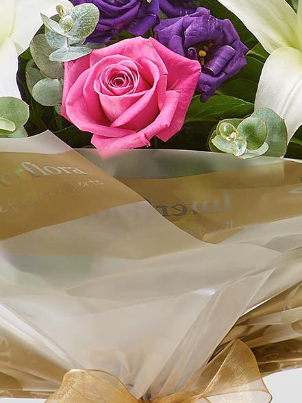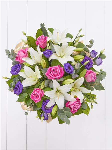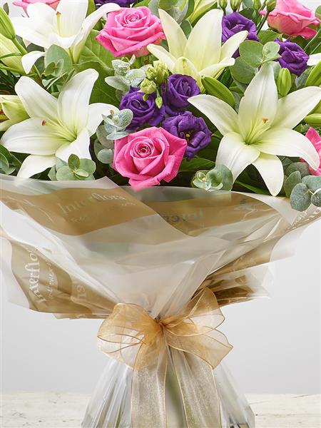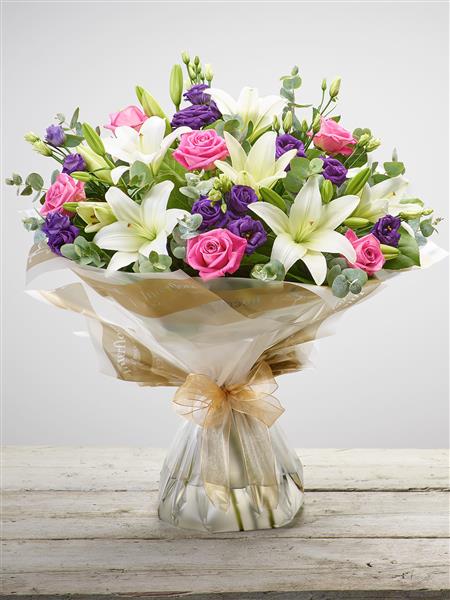 Featuring pink large headed roses, white LA lilies and purple lisianthus, hand-tied with eucalyptus and salal, and presented in Gift Packaging.