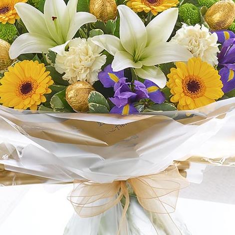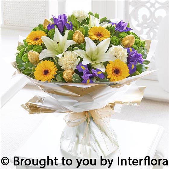 Featuring green spray chrysanthemums, yellow germini, blue iris, a cream LA lily and cream carnations with salal, pittosporum and foil-covered chocolate Easter eggs, wrapped and presented in Interflora Gift Packaging.