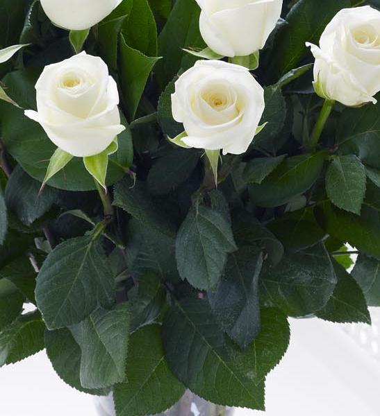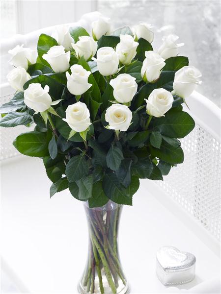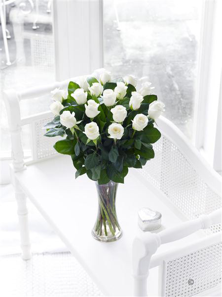 Featuring 15 large-headed white roses with presented in a slim-waisted glass vase.