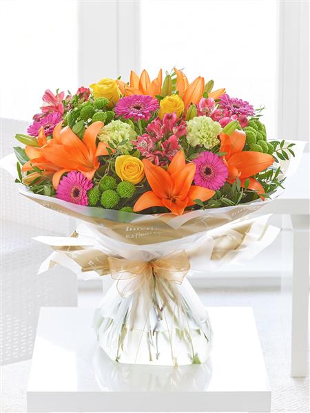Someone is going to love this gift. The kaleidoscope of radiant colour ensures this striking hand-tied takes centre stage right away. With roses, lilies, carnations, chrysanthemums and so much more, this is certainly the right choice of gift to make an impression.