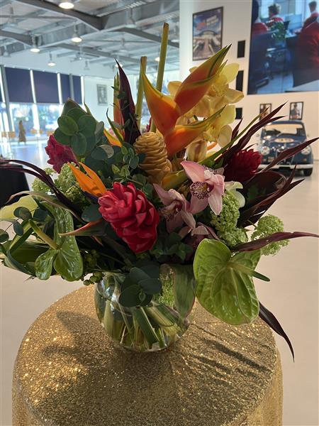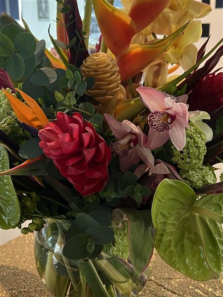 A tropical flower vase containing exotic colourful flowers from all over the world.