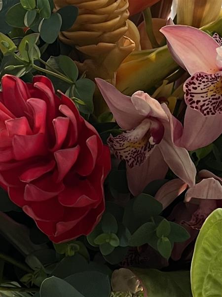 Bright Orange Strelitzia, Cymbidium Orchids, Orange Leucospurnums, Tropical Red Gingers, mixed Heliconias in an array of colours, Palm Leaves and Anthuriums.