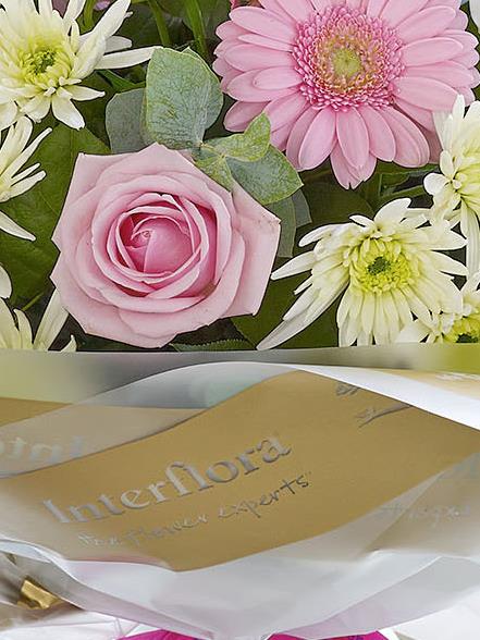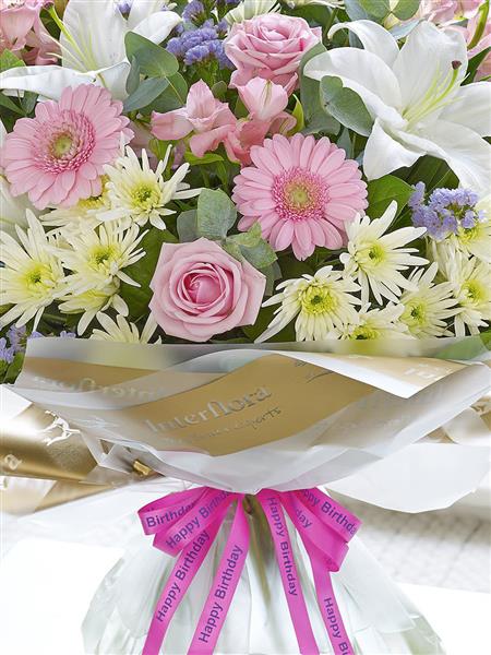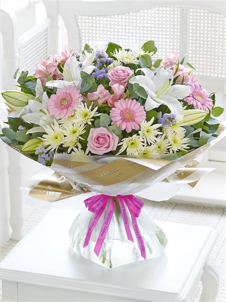 Featuring 2 pink alstroemeria, 1 white Oriental lily, 1 long-stemmed pink rose, 3 white spray chrysanthemums, lilac statice and 3 pink germini with Eucalyptus Cinerea and salal.