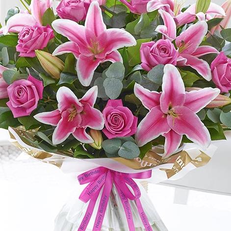 Featuring pink Oriental lilies and pink large headed roses with salal and eucalyptus, wrapped and trimmed with ‘Happy Birthday’ ribbon and presented in Gift Packaging.