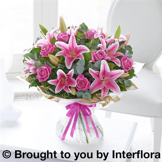 Featuring pink Oriental lilies and pink large headed roses with salal and eucalyptus, wrapped and trimmed with ‘Happy Birthday’ ribbon and presented in Gift Packaging.