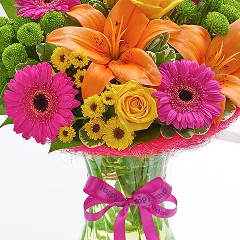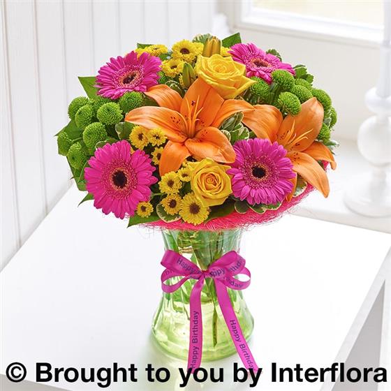 Brighten their birthday with this fabulous gift of fresh flowers in a kaleidoscope of dazzling colour. We’ve chosen a stunning selection of varieties including germini, Asiatic lilies and a fresh rose, in a colour palette that is bursting with energy. It’s the perfect way to celebrate their special day.