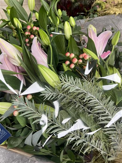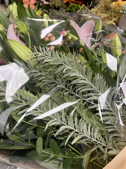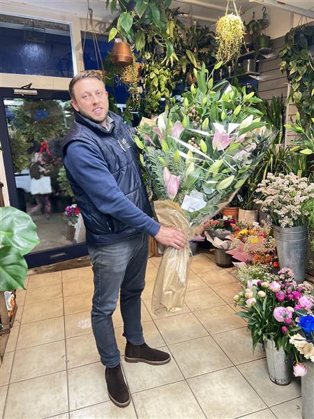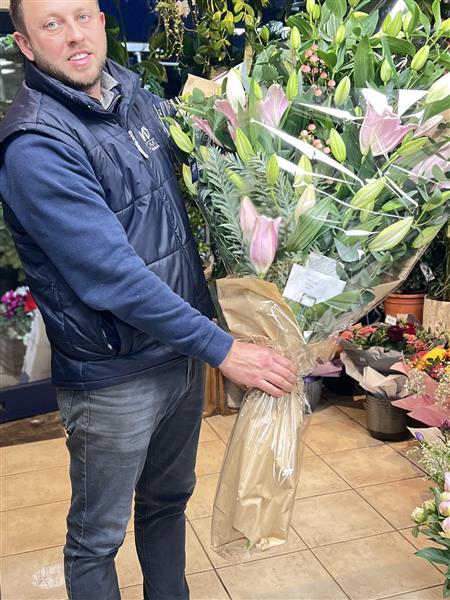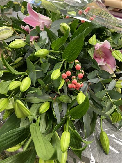 A large bouquet of mixed Oriental Lily’s. We will use a beautiful selection of White, Pink and Cream Oriental Lily to make this showstopper bouquet. Comes with mixed bunches of our large eucalyptus and some fillers and berries such as Hypericum and mimosa foliage.