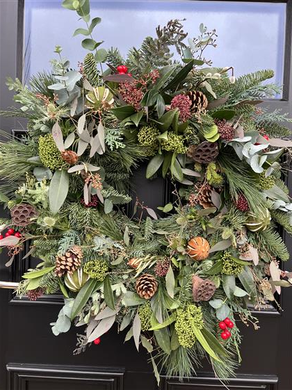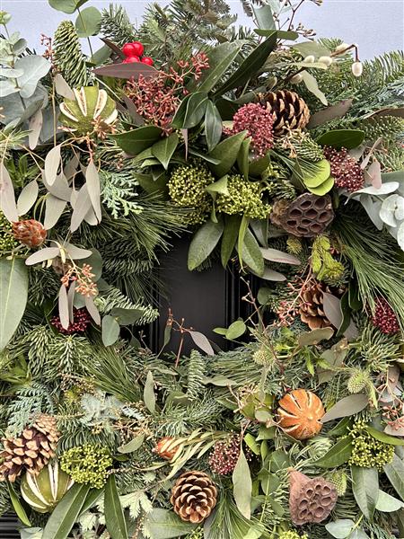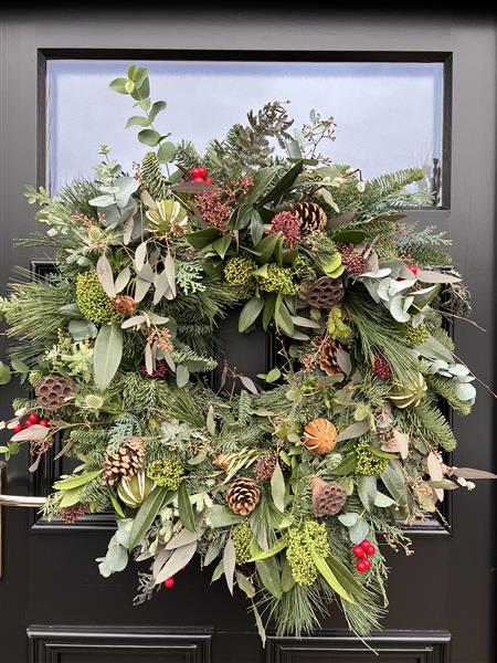 A large natural wreath made with a nice mix of seasonal flowers and dried fruits and cones.