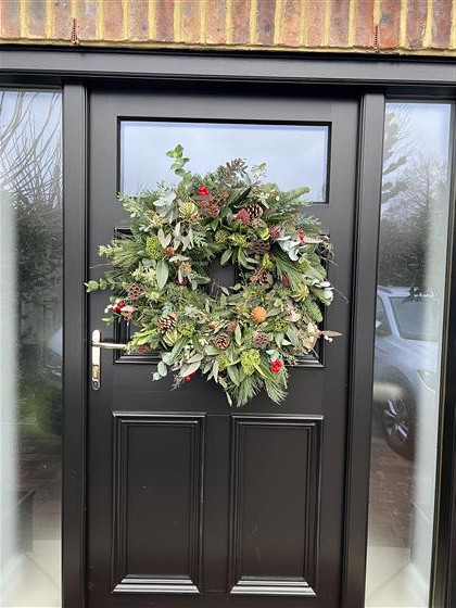 We used Eryngium Thistles which look amazing and go with tradition aswell as adding Green and Red Skimmia which lasts really well. A mixture of fresh Eucalyptus including a red one with berries.
