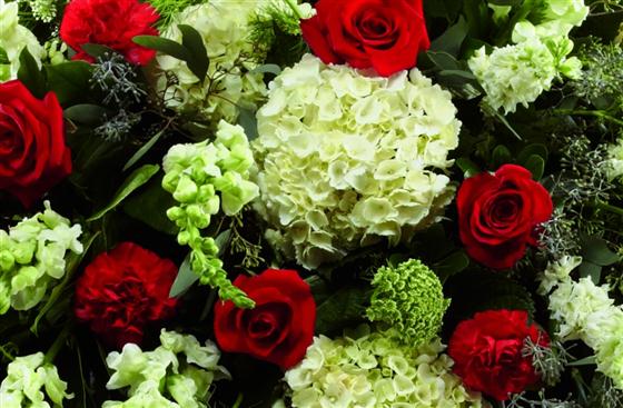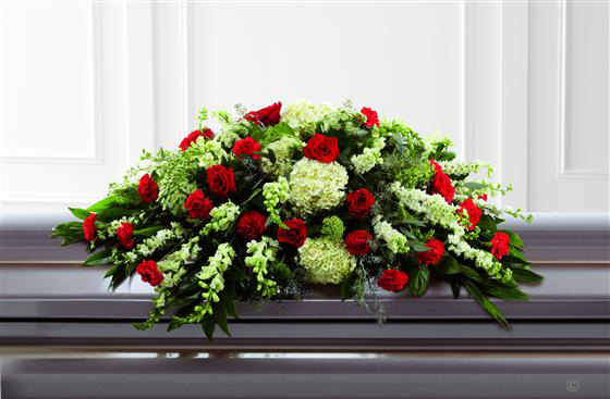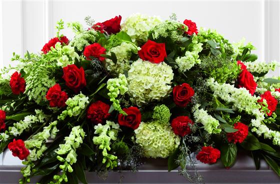 Rich red Rose and carnations are an eye-catching addition to a bed of white hydrangea, larkspur, antirrhinum, Queen Anne's lace and choice foliage to create a beautiful casket spray.