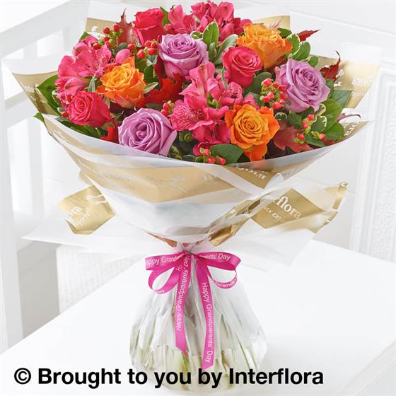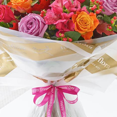 Featuring cerise alstroemeria, red spray hypericum, lilac large headed roses, orange medium headed roses and cerise medium headed roses with burgundy oak leaves, pittosporum and salal, wrapped and presented in a gift packaging.
