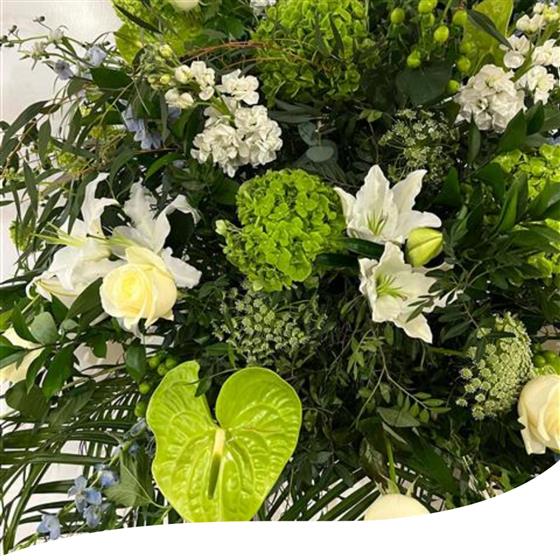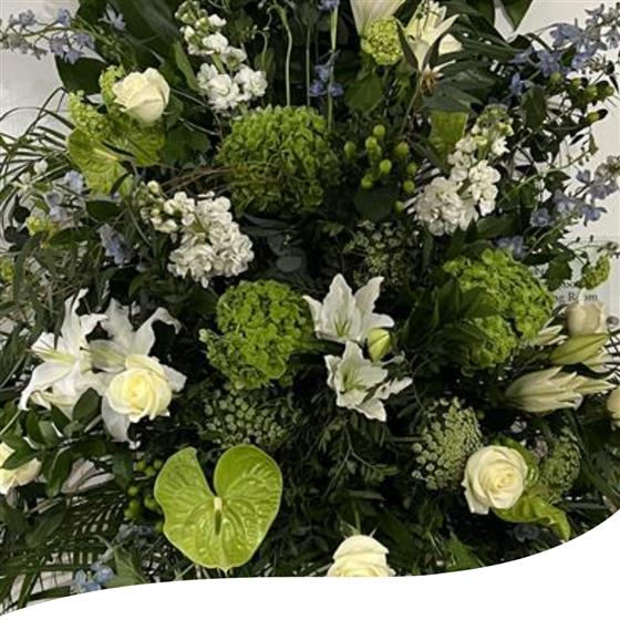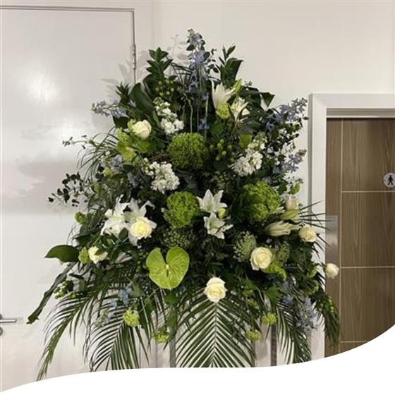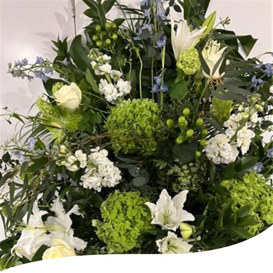 We will use a nice mix of luxurious flowers to create a stunning display. Lily’s, Roses, Viburnum, Hydrangeas, Delphiniums, Veronicas, Ammi, Stocks and a lovely selection of foliage.