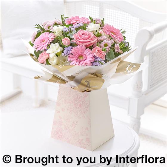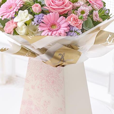 Featuring white freesia, pink germini, pink rose, pink spray chrysanthemums, pink spray carnation and lilac statice with eucalyptus, rosemary and salal tips, presented in a pretty floral design gift box.
