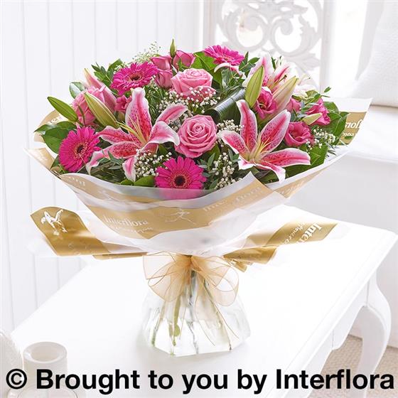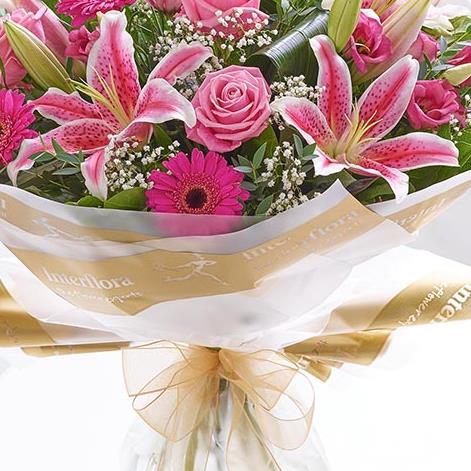 Featuring pink Oriental lily, pink large-headed roses, cerise germinis and pink lisianthus, hand-tied with gypsophila, aspidistra leaves, eucalyptus and salal and presented in Gift Packaging.