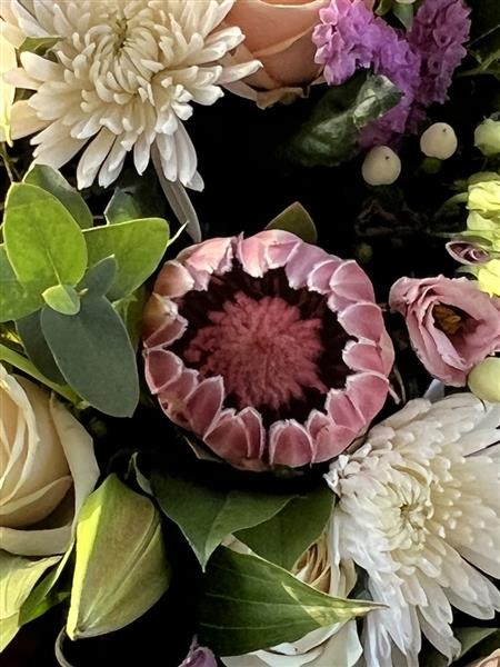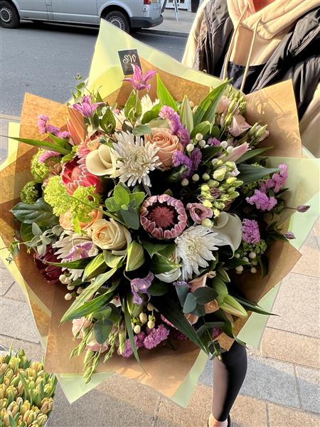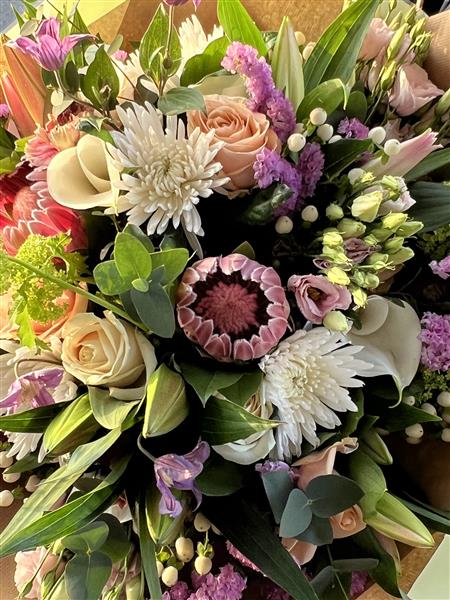 This large bouquet is made with a stunning selection of mixed seasonal flowers such as Pearl avalanche roses, White XL Blooms, Grape Lisianthus, White Coco Hypericum, Lily’s, clematis, and Limonium Statice.