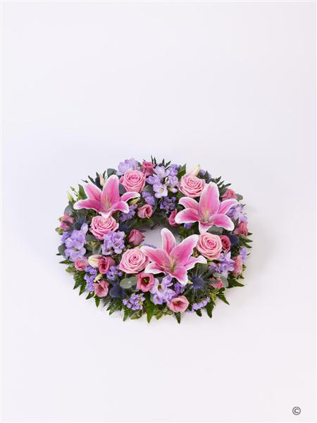 Lily and large-headed roses in pink are nestled amongst freesias and lisianthus in lilac along with blue eyngium and foliage in this circular wreath. Approximate diameter 44cm (17 inches).