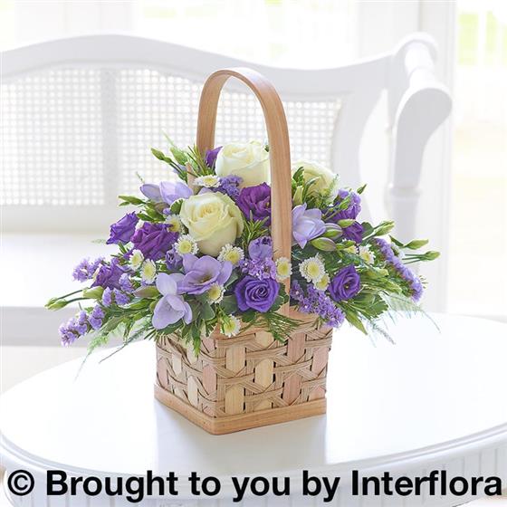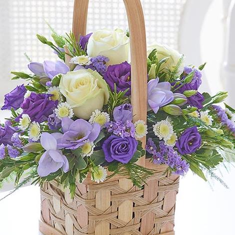 Featuring lilac statice, blue lisianthus, ivory large headed roses, lilac freesia and a white spray chrysanthemum with asparagus fern, pittosporum and rosemary, presented in a natural softwood basket.