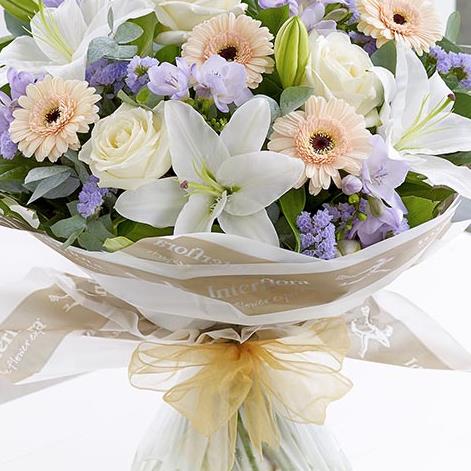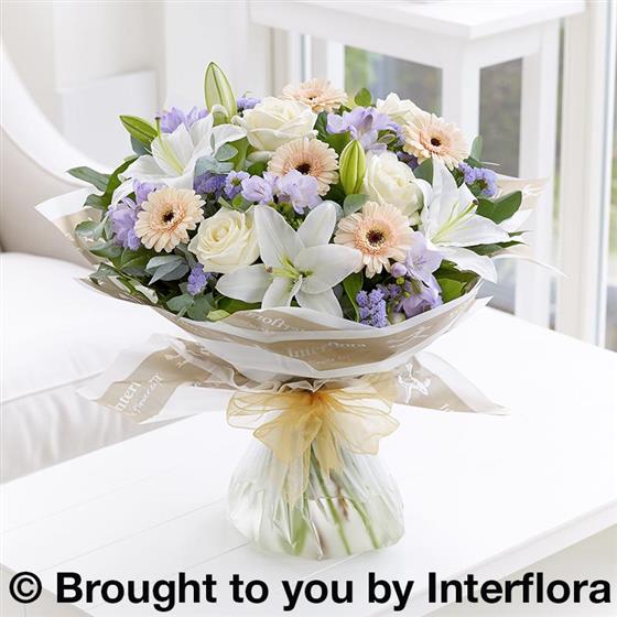 Featuring purple freesias, peach germini, lilac statice, white Oriental lily and large-headed ivory roses with eucalyptus and salal, presented in Gift Packaging.