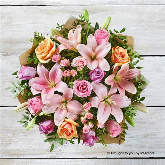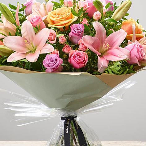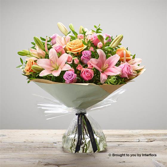 Featuring pink, lilac and peach large headed roses with pink LA lilies, pink spray roses and pistache, hand-tied, wrapped and presented in gift packaging.