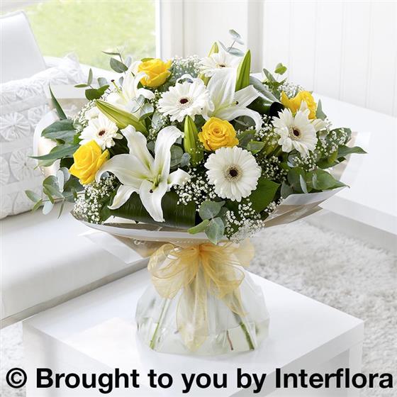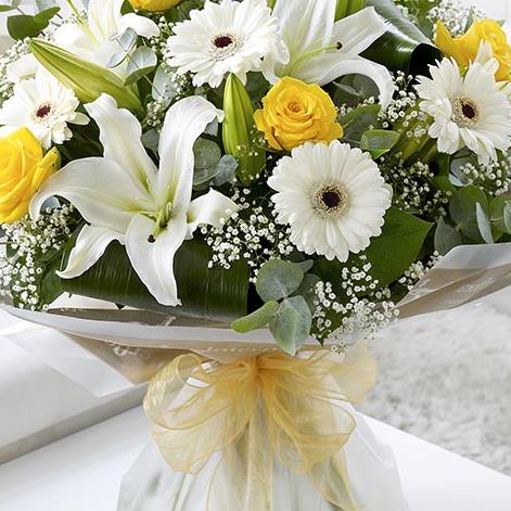 Featuring white germini, yellow large-headed roses, white Oriental lilies and white gypsophila, hand-tied with folded aspidistra leaves, eucalyptus and salal, wrapped and trimmed with gold voile ribbon.