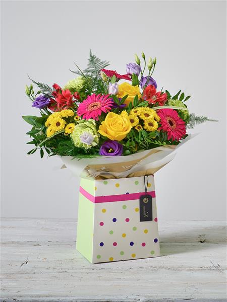Featuring 2 green carnations, 1 cerise alstroemeria, 3 cerise germini, 2 orange roses and 3 yellow spray chrysanthemums with purple statice and salal, presented in a harlequin jute bag.