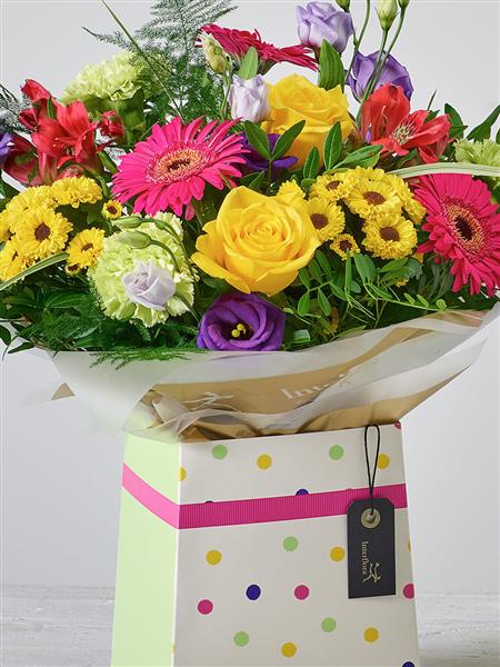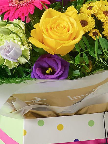 We’ve chosen the very brightest flowers to give this large gift box a celebratory feel – dark purple and fresh green; smouldering orange and hot pink; even the golden yellow with their dark centres. The result is a sensational display.