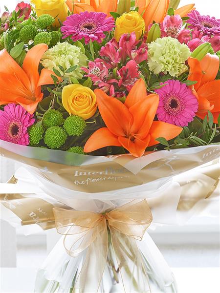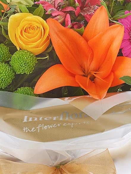 Featuring pink alstroemeria, green carnations, cerise germinis, yellow Asiatic lilies, orange large-headed roses and green spray chrysanthemums with pittosporum and salal, hand-tied, gift-wrapped and presented in Gift Packaging.