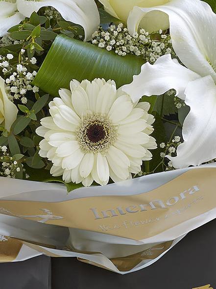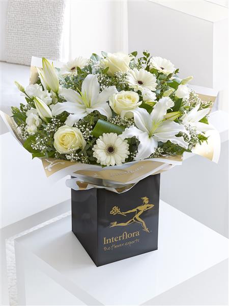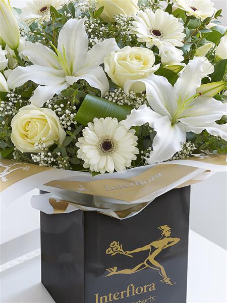 The combination of pristine white flowers, expertly arranged with fresh greenery, is hard to beat for pure, elegant simplicity. Stunning lilies and luxurious roses make this bouquet look very special, and the tiny gypsophila flowers add to the overall effect.