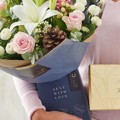 Hand-tied flowers expertly arranged and perfectly presented in a lovely gift box. Frosty tones reminiscent of a winter wonderland