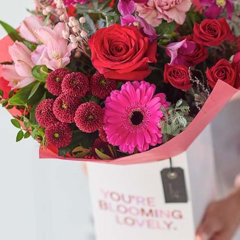 A gorgeous mix of romantic blooms, exquisitely arranged by an artisan florist and safely tucked in a beautiful giftbox. It'll feature blooms in classic Valentine's colours including cerise, burgundy and soft pink.