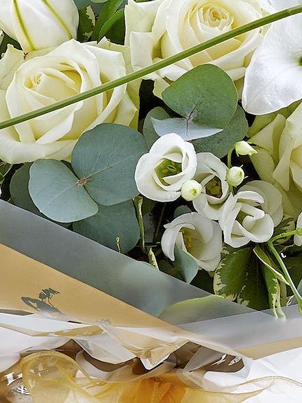 Featuring white large-headed roses, with white Oriental lilies and white lisianthus hand-tied with steel grass, salal, eucalyptus and pittosporum and presented in Gift Packaging.
