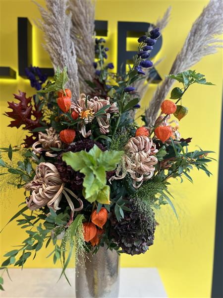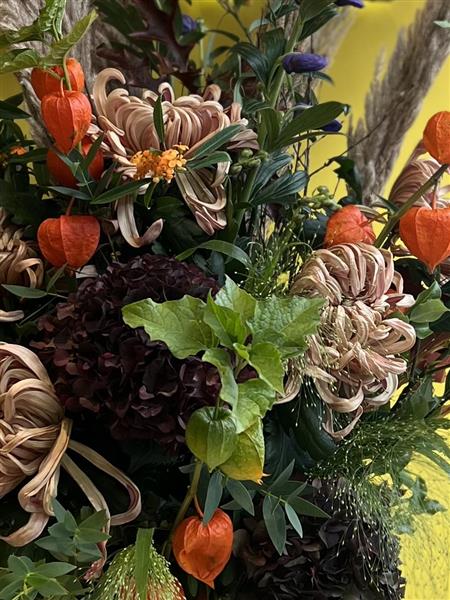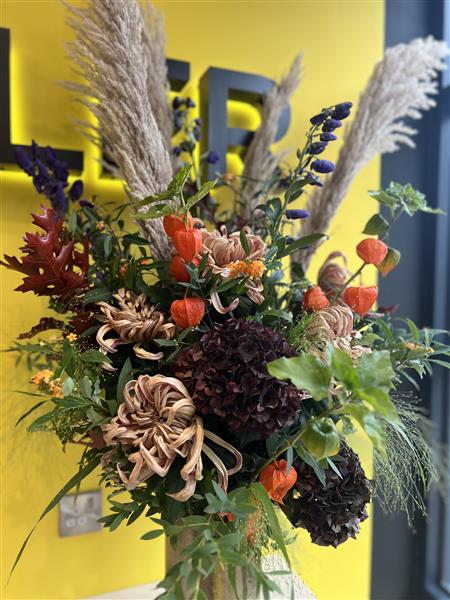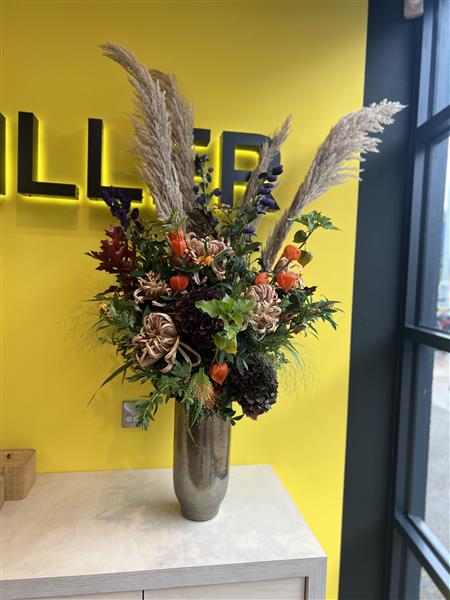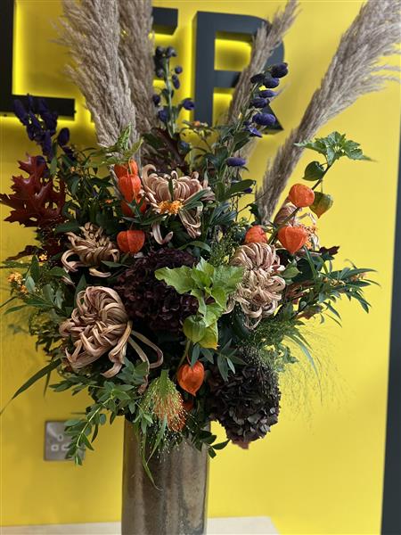Tall 120cm Pampas Grass, Orange Lanterns, burgundy Hydrangeas, Blue Aconitum, Red Oak Leaf, Orange Euphorbia and the most stunning Vienna Copper Blooms.