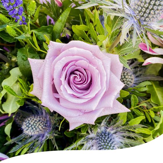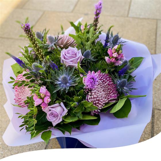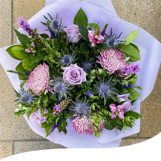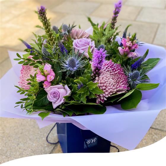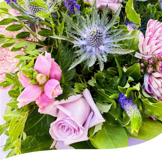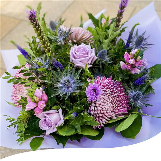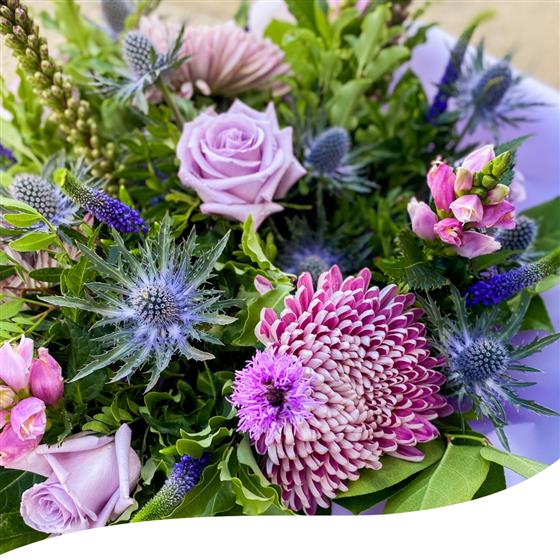 This bouquet combines lavender Roses, pink Chrysanthemums, and Blue Thistle for a sophisticated and charming look. The addition of tall Liatris and Veronicas adds elegance, while Alstroemeria brings a timeless beauty. Perfect for birthdays, anniversaries, or to brighten someone's day, this arrangement is a beautiful expression of appreciation.