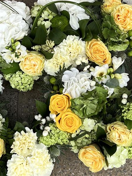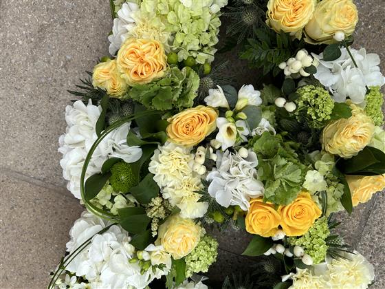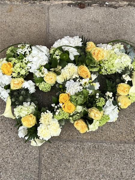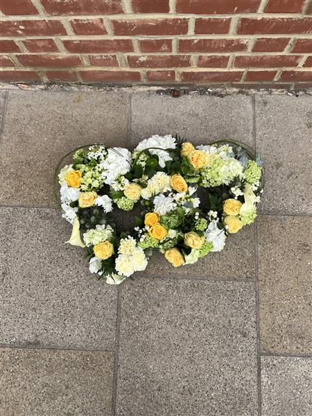 A beautiful double heart tribute using Hydrangeas, Viburnum, Roses, Calla Lily, Hypercium, Freesia, Carnations, Ornithogalum and mixed foliage.