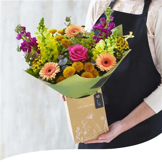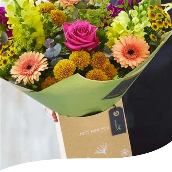 Introducing our Lemonade Dream Bouquet in large size. This stunning floral arrangement offers an even more impressive display, perfect for giving as a thoughtful gift. Expertly arranged by our skilled florists, this hand-tied features a beautiful mix of seasonal flowers in warm sunset colours, designed to bring a big smile to the recipient’s face.