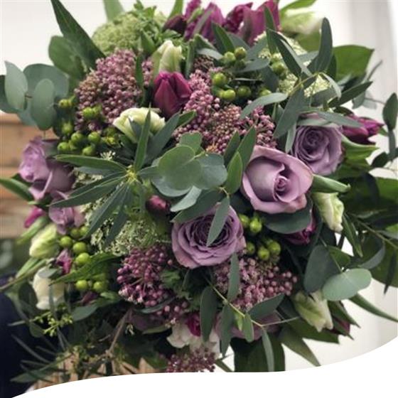 Experience the vibrant beauty of spring on your special day with our Lilac & Purple Spring Bridal Bouquet, featuring a mix of White and Green Parrot Tulips, Lilac Roses, Pink Asclepia, and various Eucalyptus. Complemented by White Ammi Visnaga, Green Hypericum, and Purple Parrot Tulips, this bouquet perfectly embodies the essence of the season.