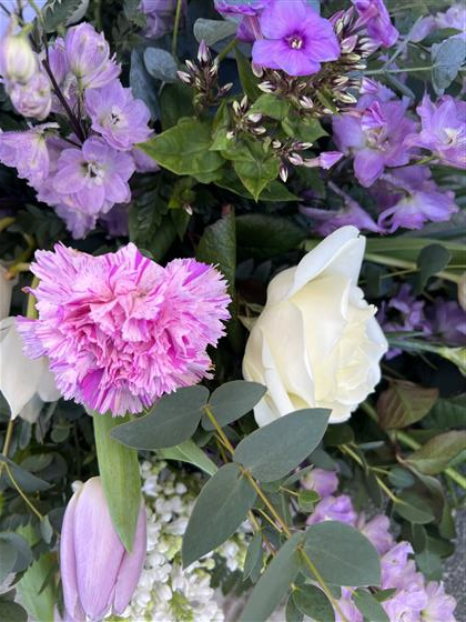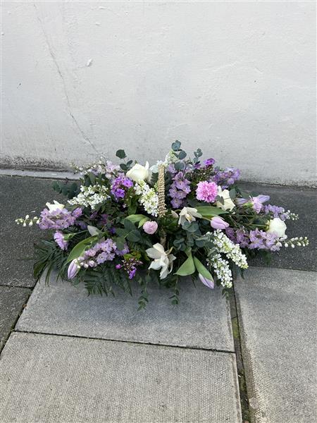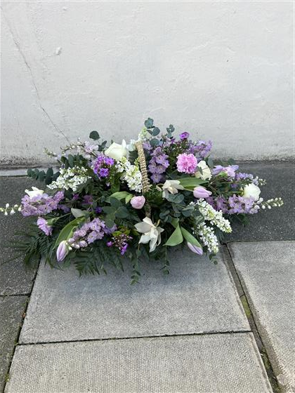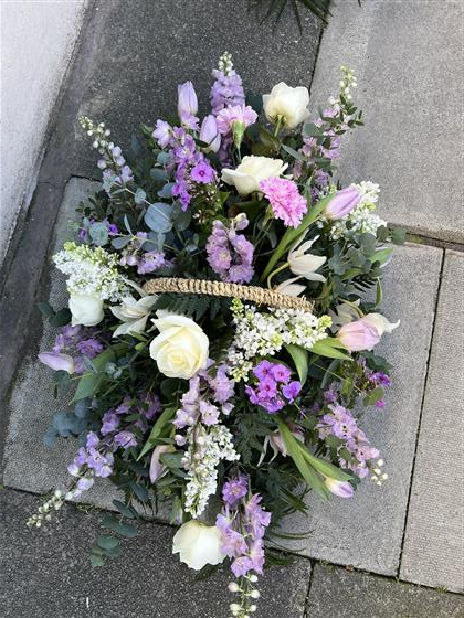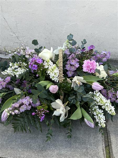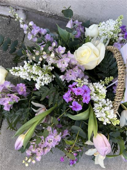 A large basket of lilac, pink and white flowers including roses, Lilac Syringia, Tulips, Phlox, Carnations, Spray Roses, Lilac Delphiniums and mixed foliage including eucalyptus.