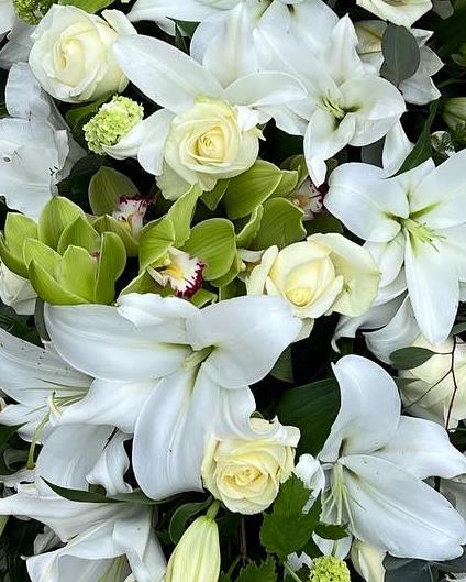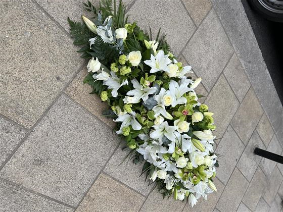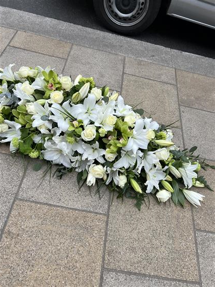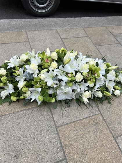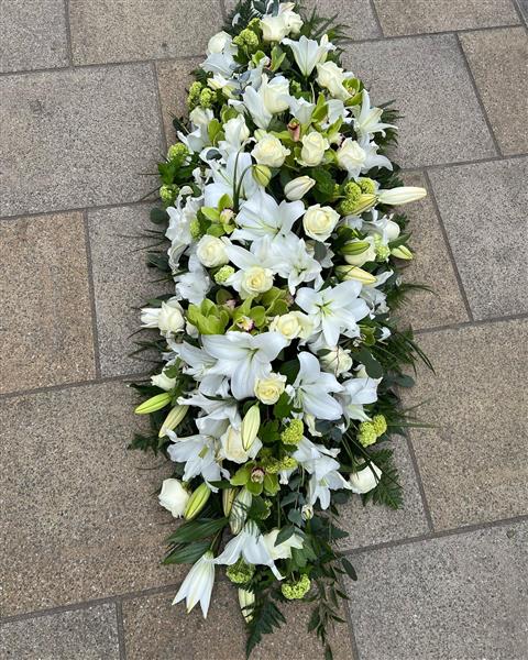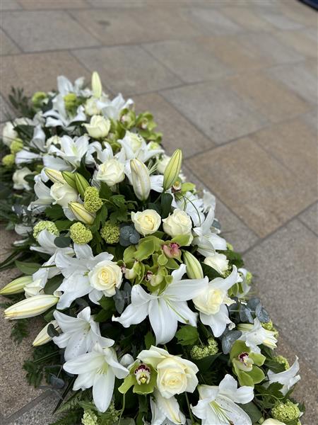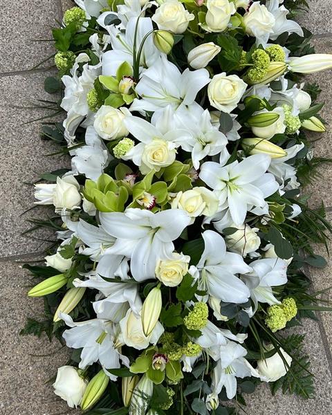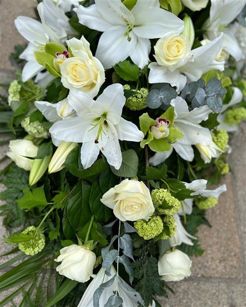 A delicate White Lily and White Rose Coffin spray with added Orchids and Viburnums. Expertly arranged to sit beautifully on top of a coffin. The Lily’s will be perfectly open throughout. Green Cymbidiums offset the roses and lily well and make the whole arrangement work.