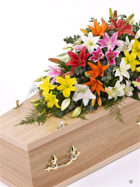 A blanket of Oriental Lily in mixed colours is beautifully complemented by an array of luxurious deep green leaves to create this simple but striking casket spray. Approximate height 153cm (5ft).