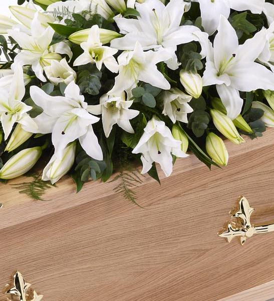 A blanket of white Oriental Lily is beautifully complemented by an array of luxurious deep green leaves to create this simple but striking casket spray. Approximate height 122cm (4ft).