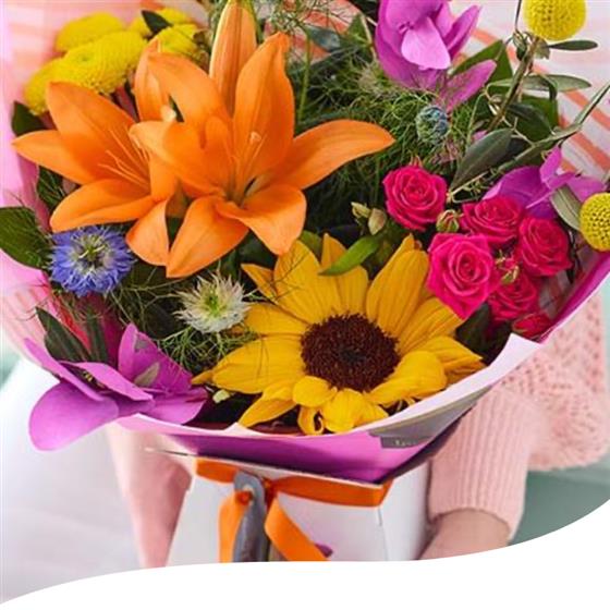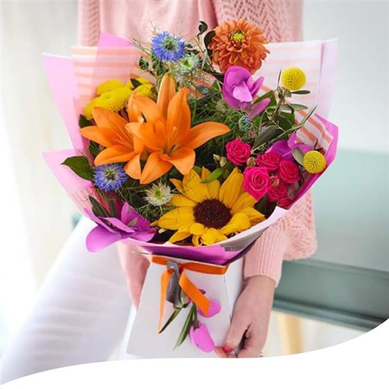 This hand-tied bouquet is designed in a trendy style with lush, richly coloured flowers. You can expect vibrant cerise, reds, fiery orange and pops of blue or yellow, along with dried flowers or foliage for added texture—just like a vibrant summer sunset. Please note that this bouquet contains Lilies.