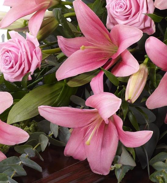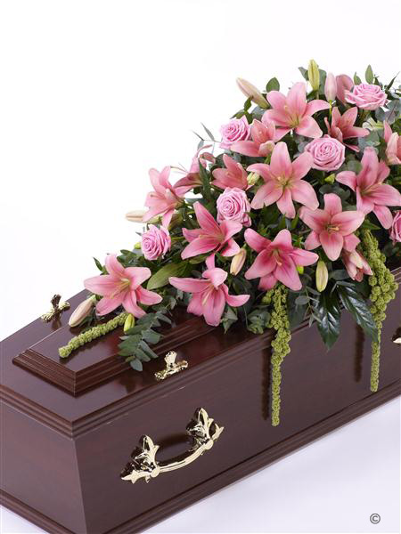 Beautiful Asiatic Lily and large-headed Rose in pretty pink are used to create this elegant casket spray. The fresh flowers are enhanced with trails of green amaranthus as well as ruscus, aralia leaves and eucalyptus. Approximate length 153cm (5ft).