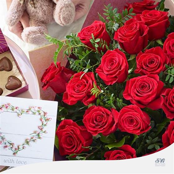 Captivate hearts with our Love Bundle, 24 Red Roses With Teddy Bear & More – a delightful gift set featuring Raspberry Ganache Milk Chocolate Hearts, a cuddly Teddy Bear and a heart-warming With Love Greetings Card. This ensemble is expertly arranged and perfectly presented. Embrace the beauty of uniqueness and express your love in every petal.
