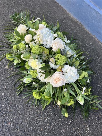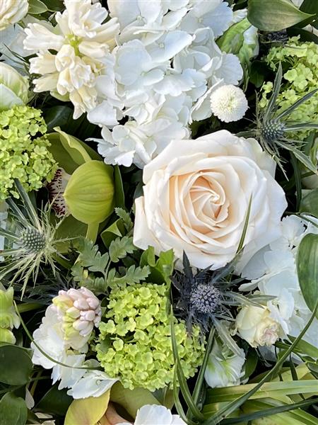 A luxurious coffin spray made with Green Viburnum, Snowball Hydrangeas, Dorchester Roses, Cream Spray Roses, Green Cymbidium Orchids, Eryngium Thistles, White Parrot Tulips and a selection of choice foliage.