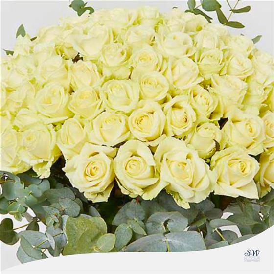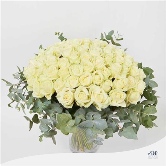 Our Luxury 50 White Rose Vase with Eucalyptus is a breathtaking arrangement that captivates with its pure elegance. The Deluxe option features 75 White Roses, while the Luxury option boasts an impressive 100 White Roses and comes in a vase. The long-stemmed Eucalyptus adds a touch of sophistication, making this vase a truly luxurious gift.