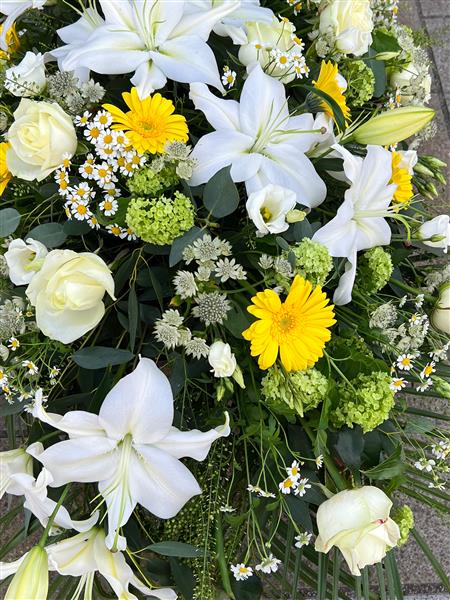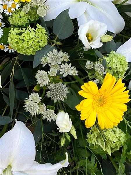 A luxury coffin spray consisting of flowers such as Roses, Lilies, Lisianthus, Yellow Gerberas, Daisies, Astrantia, Thlaspi Green Bell, Eucalyptus, Palm Leafs, & Mixed Foliage.